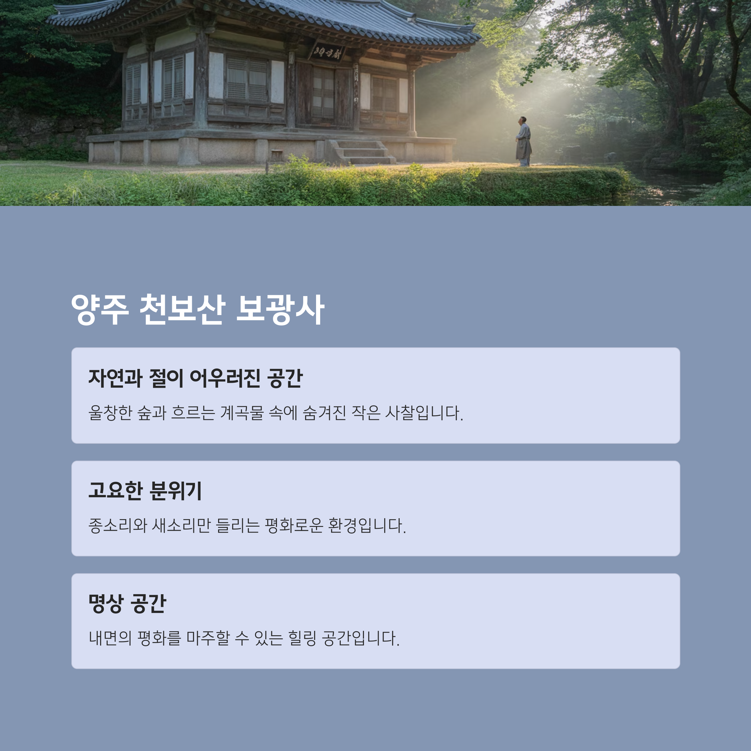 | 양주 천보산 | 숲속 절, 조용한 명상 분위기 |