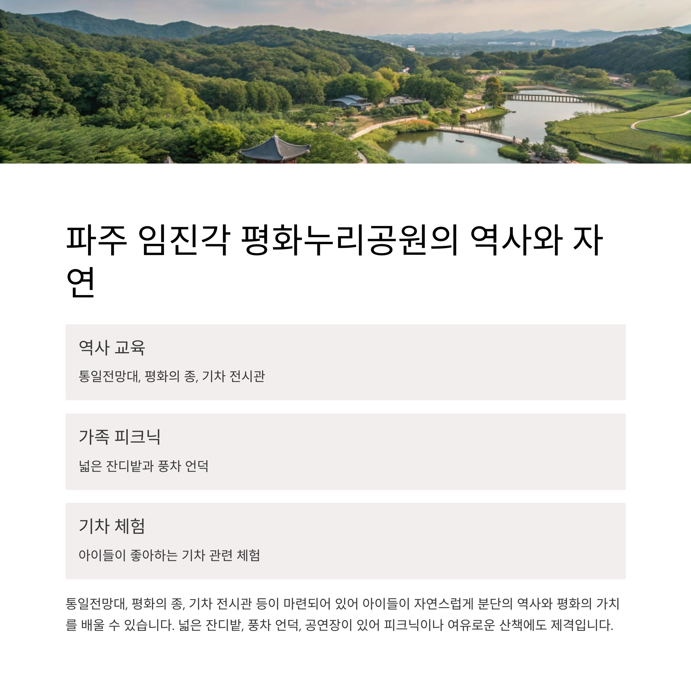 | 파주 임진각 | 역사 교육, 잔디 피크닉, 기차 체험 |