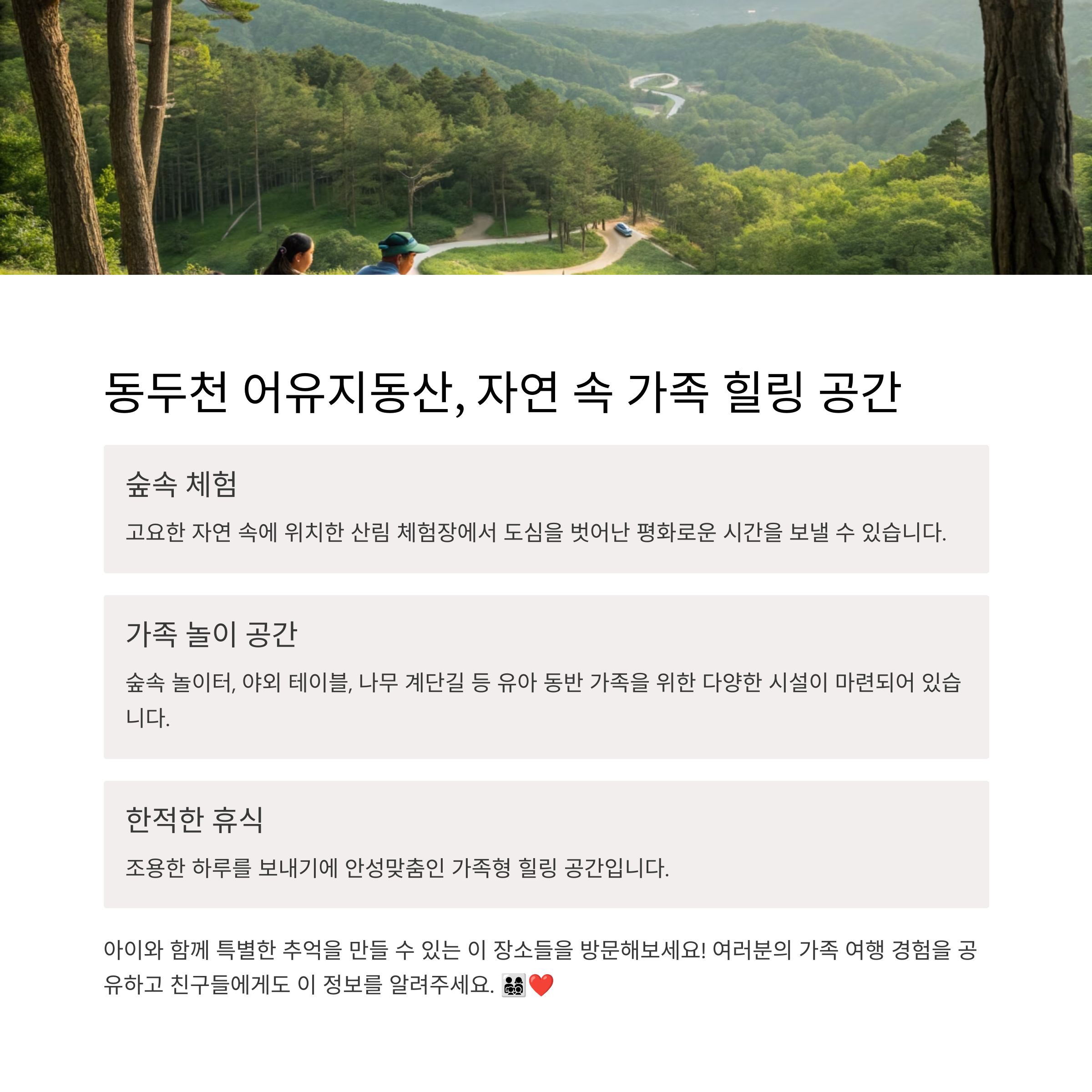 산림 체험장이 함께 있는 가족형 힐링 공간입니다.