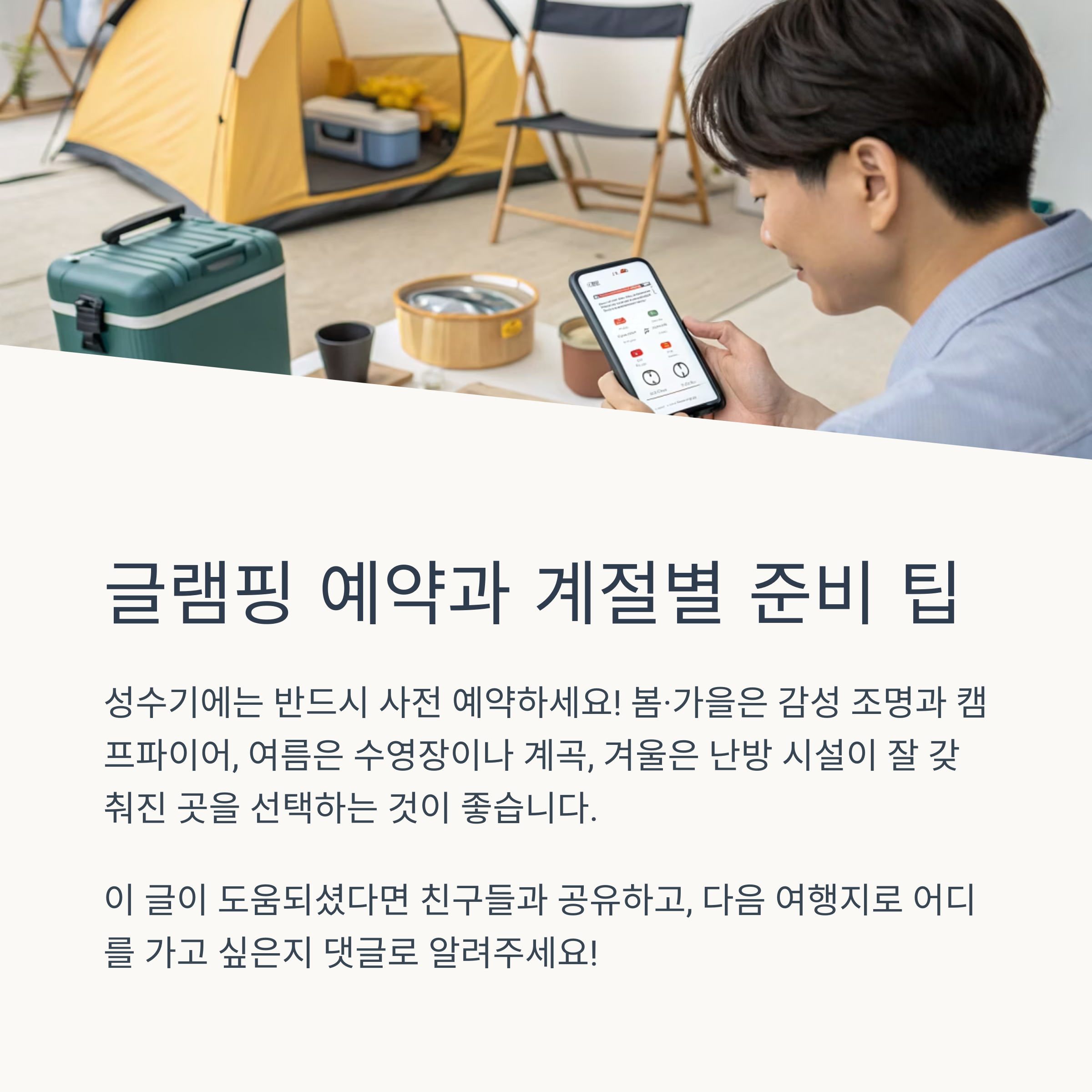 대부분의 글램핑장은 온라인 사전 예약제로 운영되므로, 방문 전에 반드시 확인하세요.