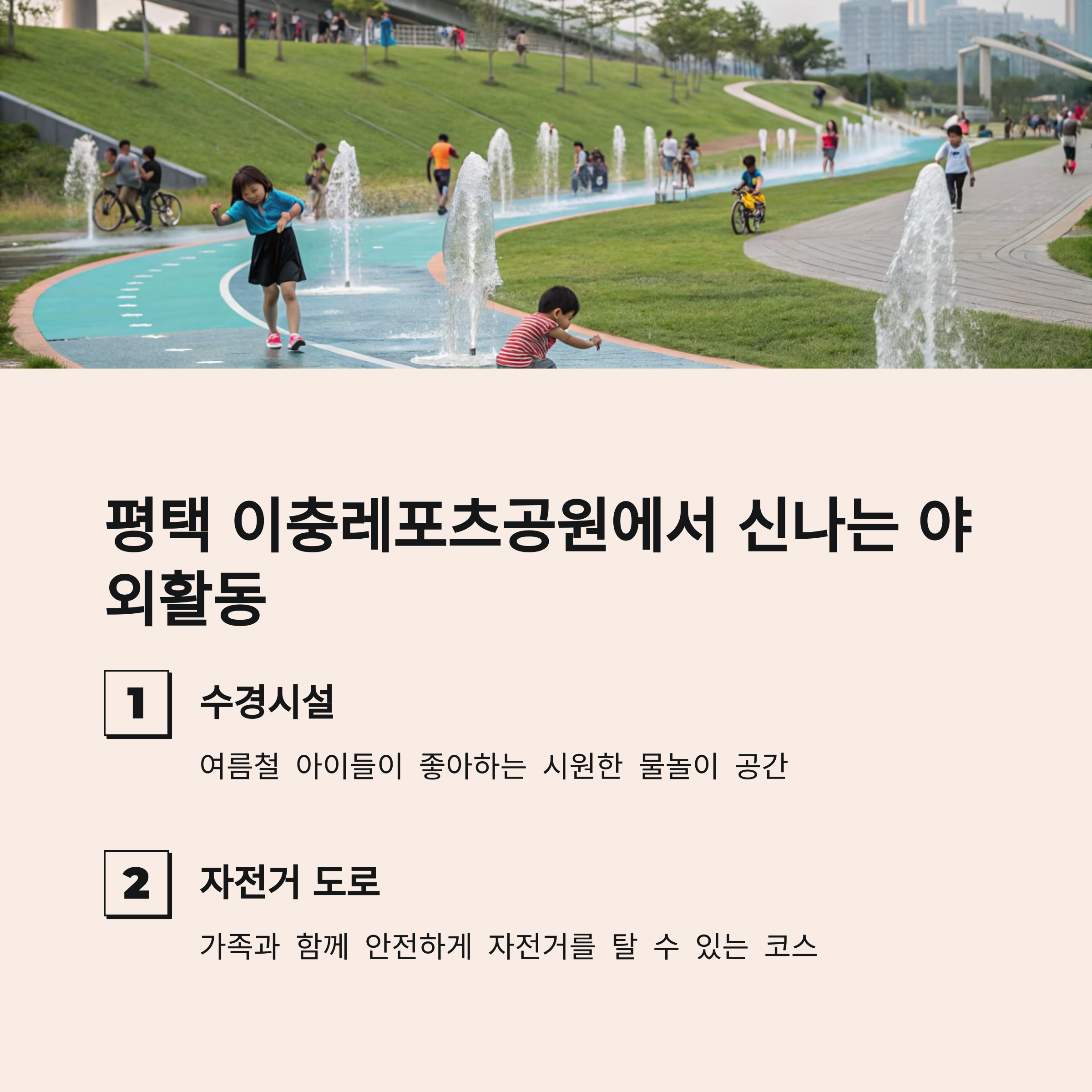 여름철 추천 장소로 평택의 이충레포츠공원은 수경시설, 자전거 도로,