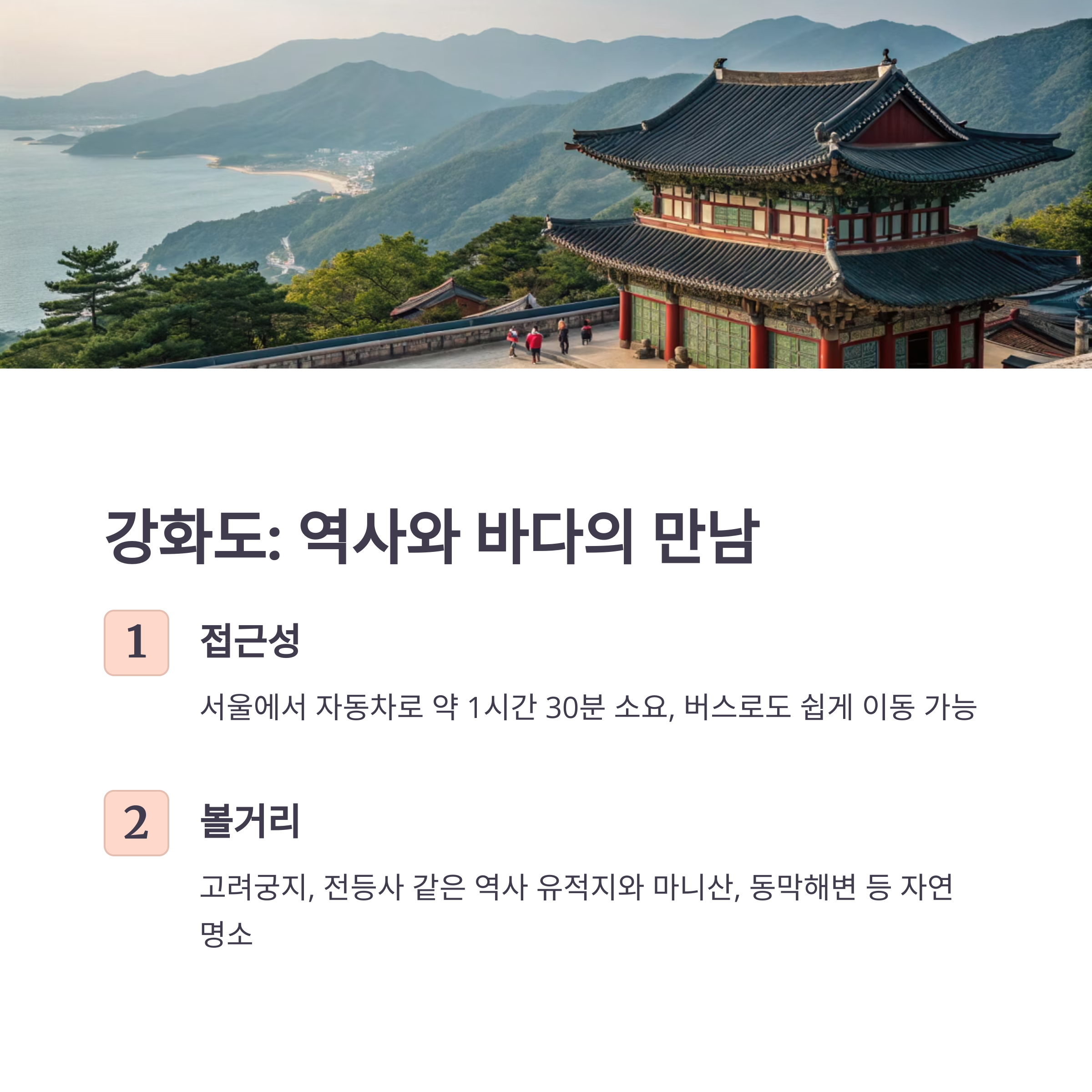 고려궁지, 전등사 같은 역사 유적지부터 마니산, 동막해변 같은 자연 명소까지