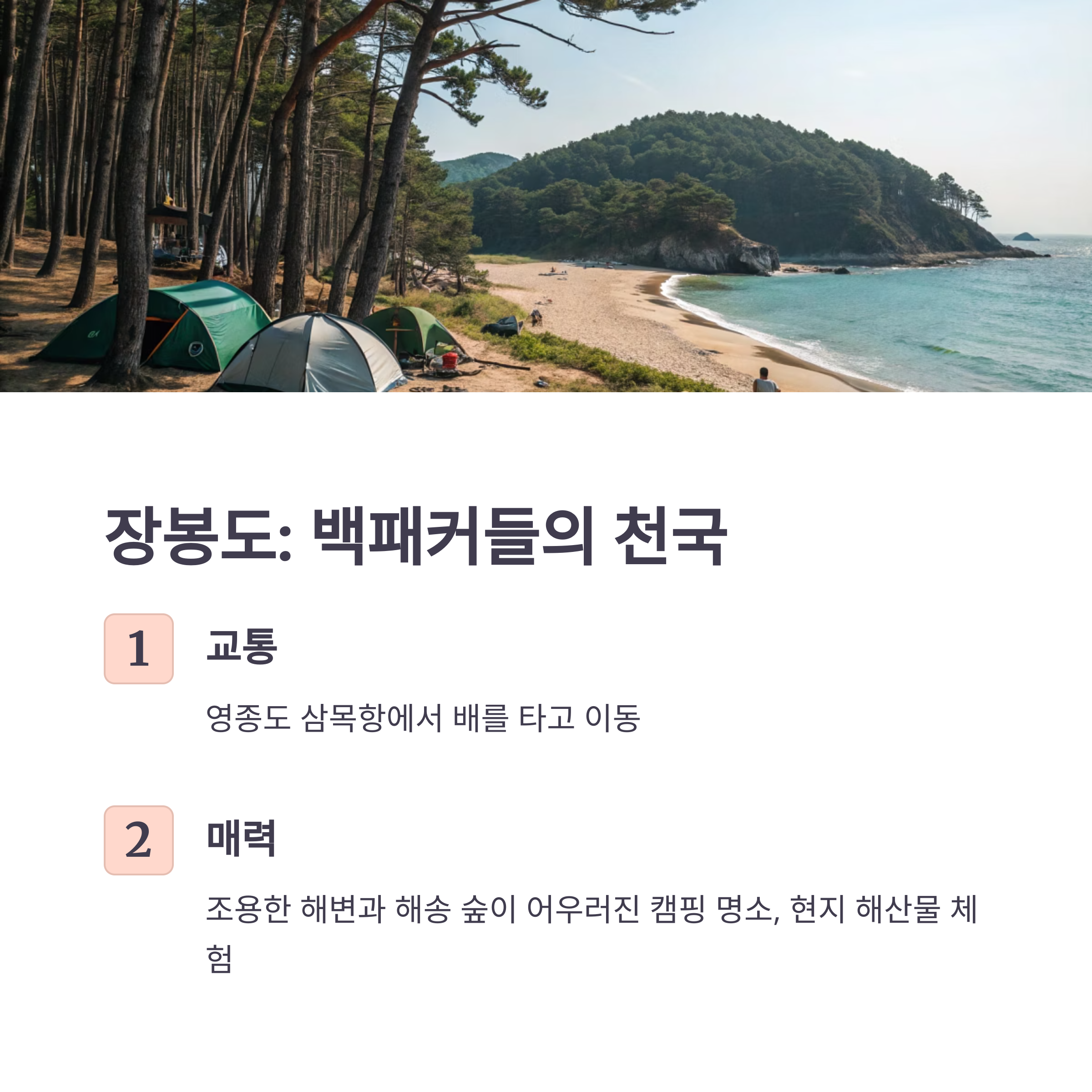 조용한 해변과 해송 숲이 어우러져 캠핑족들에게 인기 있는 섬입니다.