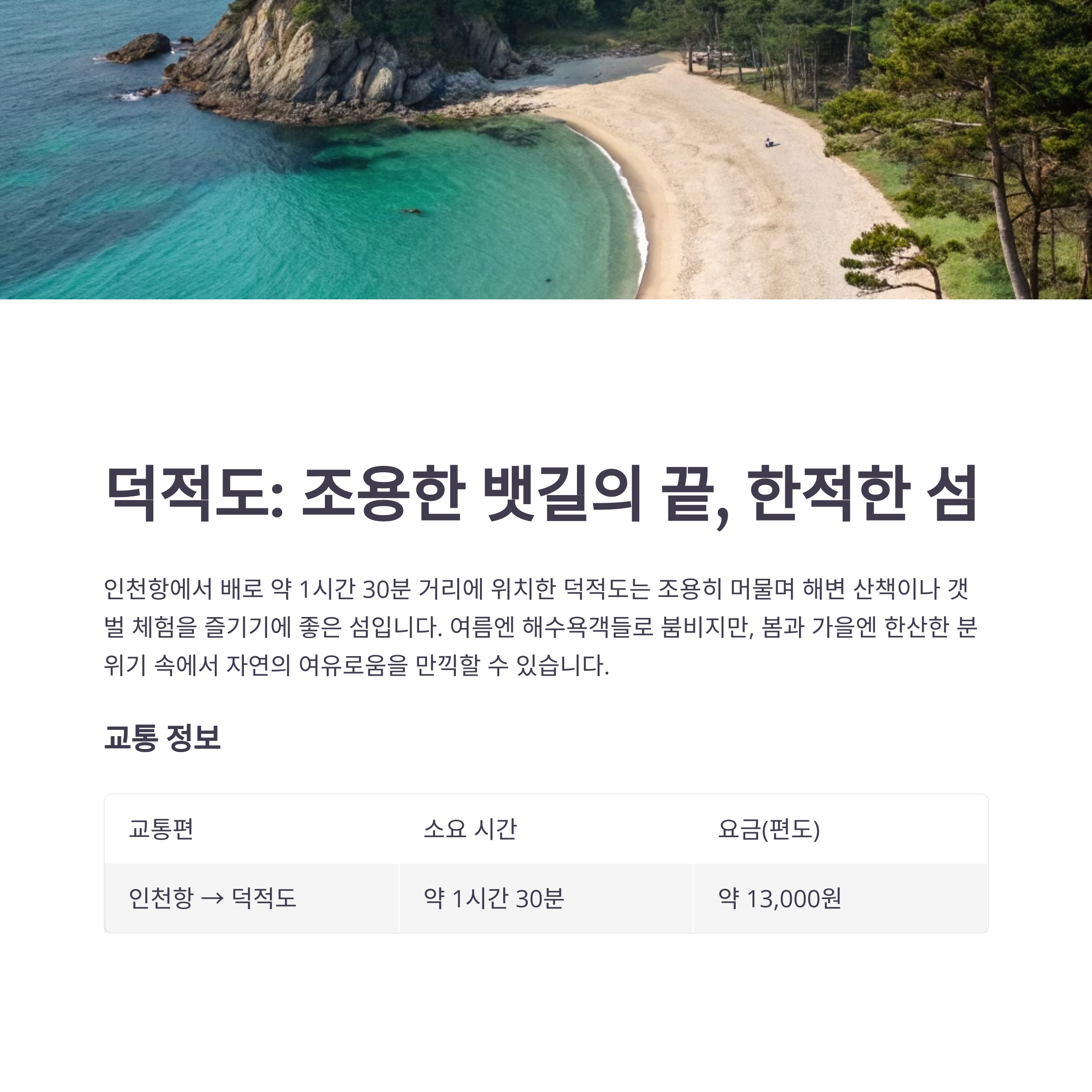 | 인천항 → 덕적도 | 약 1시간 30분 | 약 13,000원 |