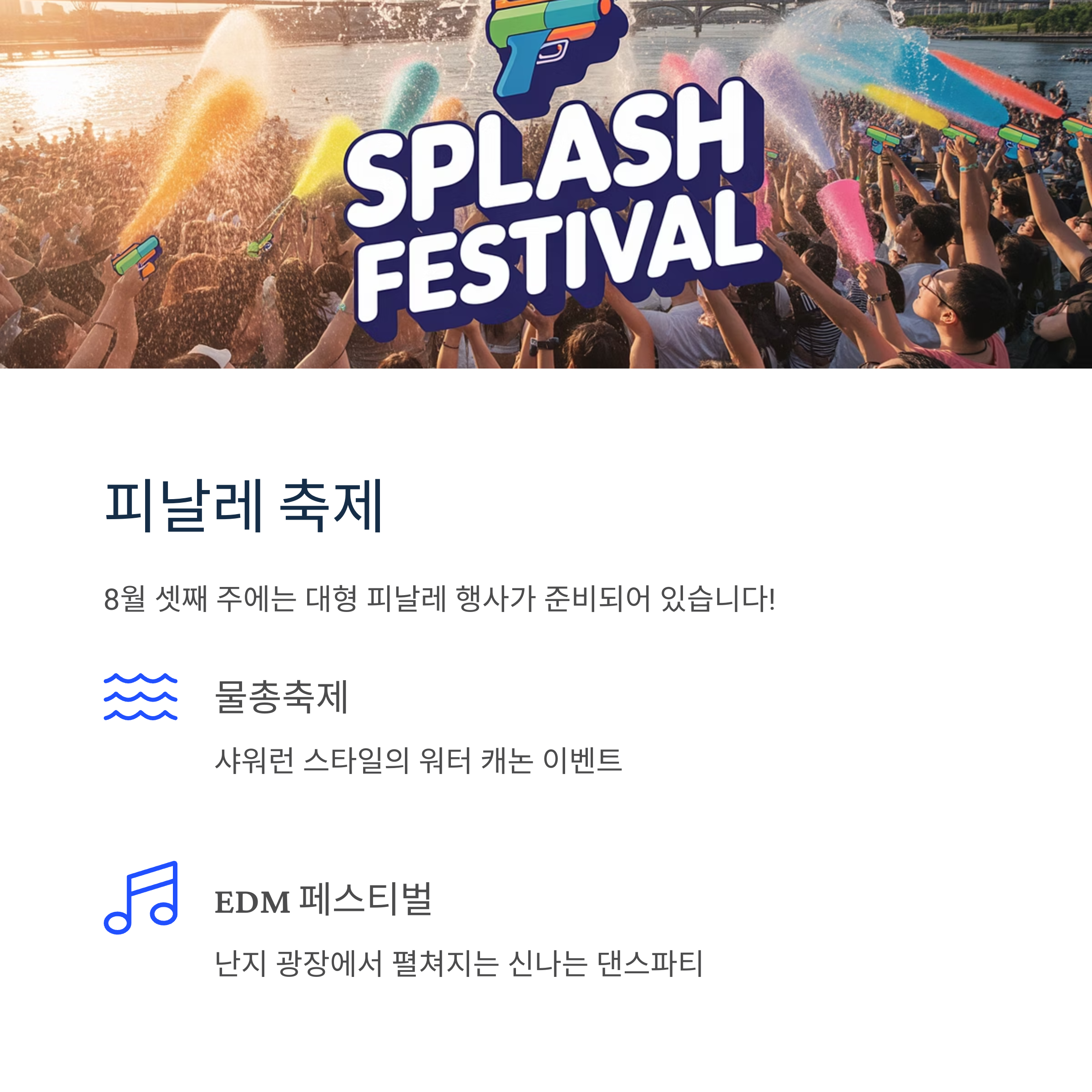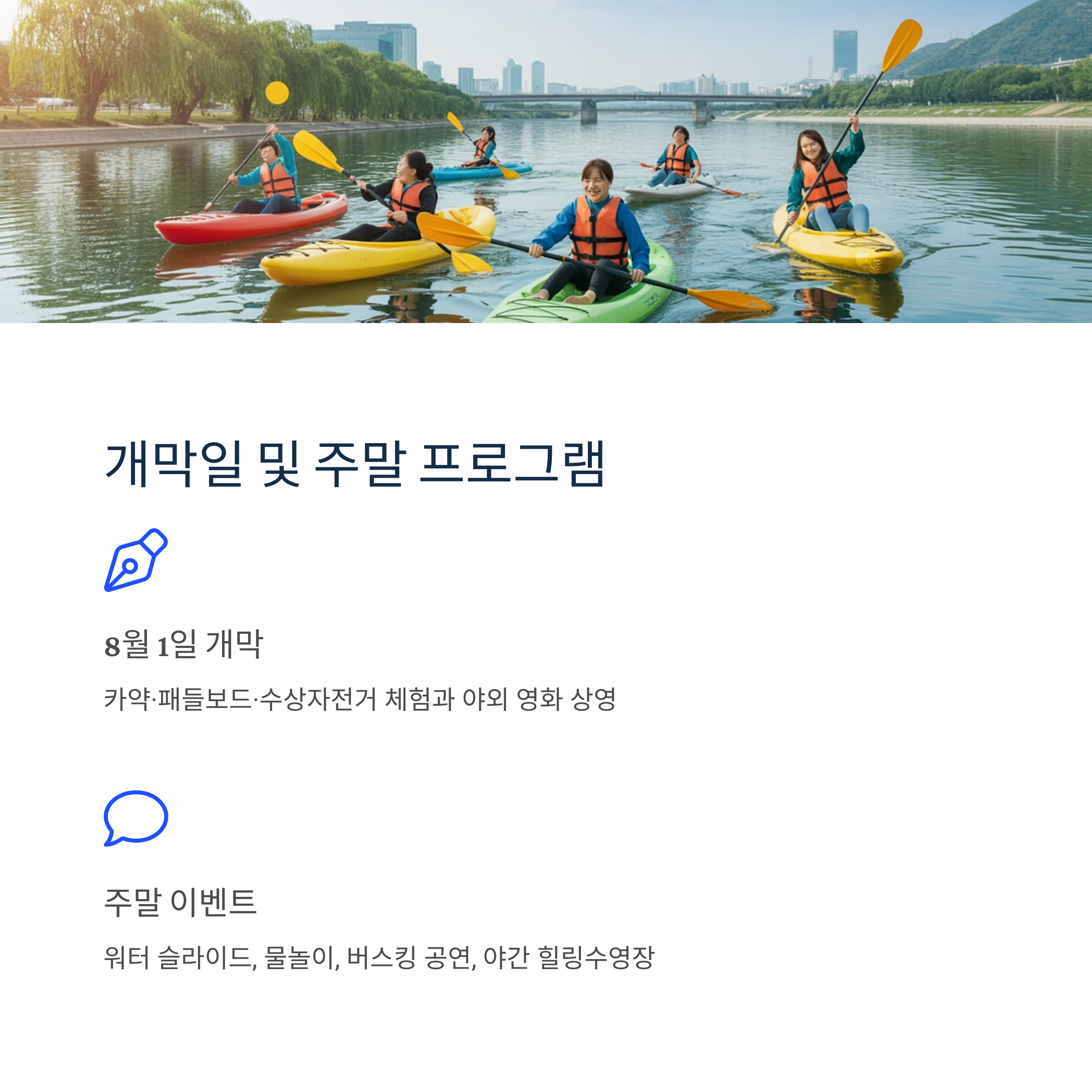 | 8월 주말(2~3주) | 뚝섬·반포·여의도 등 | 워터 슬라이드, 키즈 워터 이벤트, 공연들 | 홈페이지/현장 |