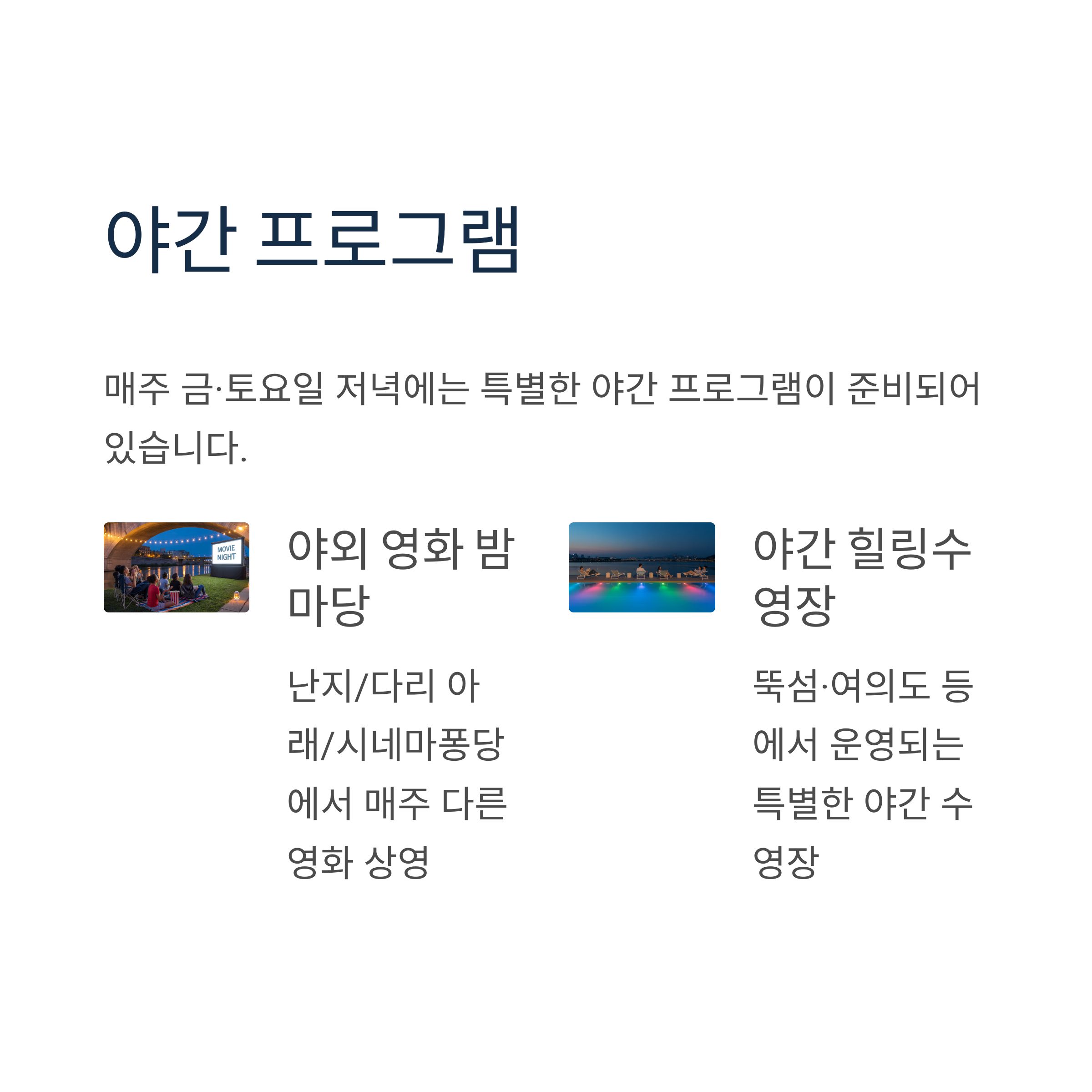 - 야간 힐링수영장 운영 (뚝섬·여의도 등)