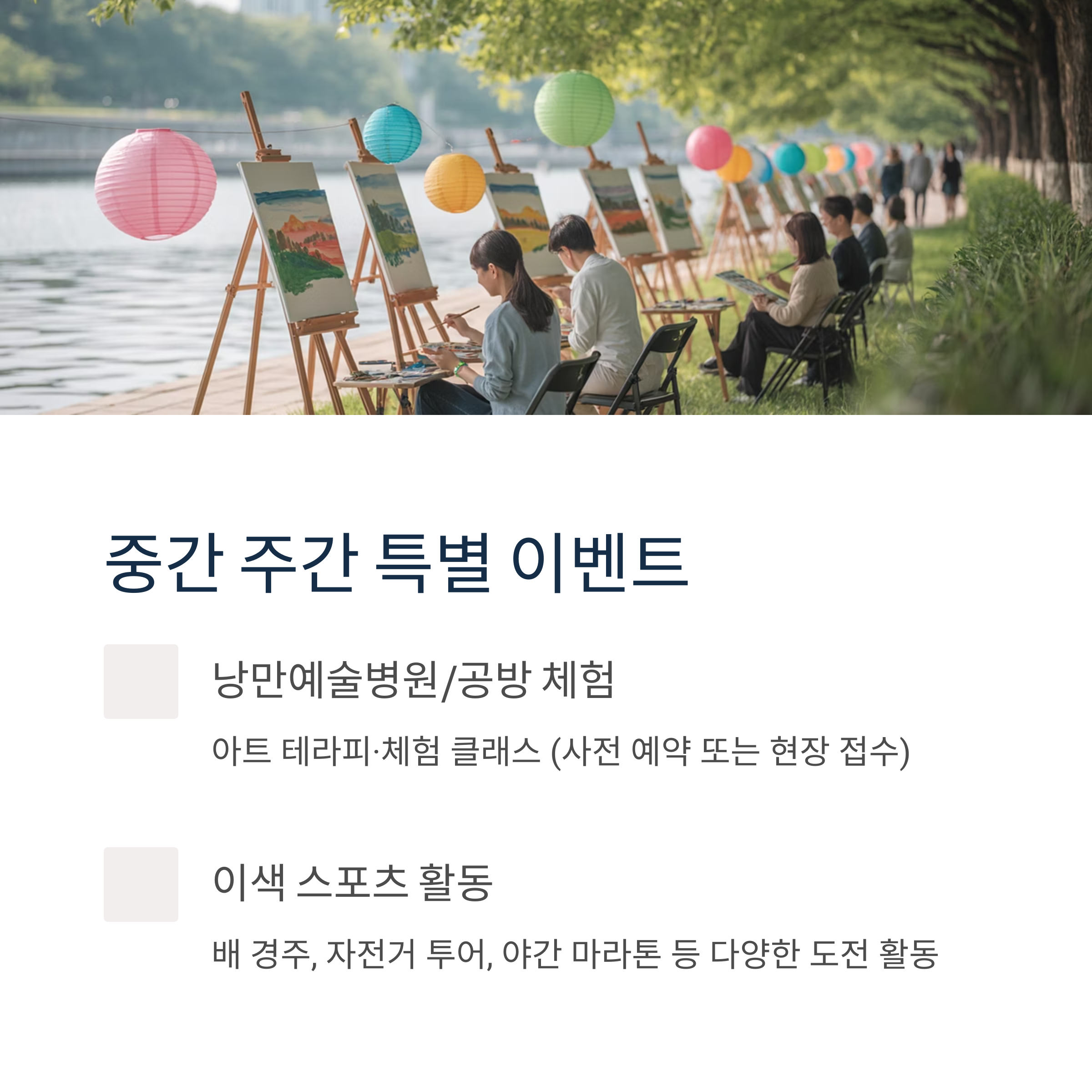 - 낭만예술병원/공방 체험: 아트 테라피·체험 클래스 (사전 예약 또는 현장 접수)