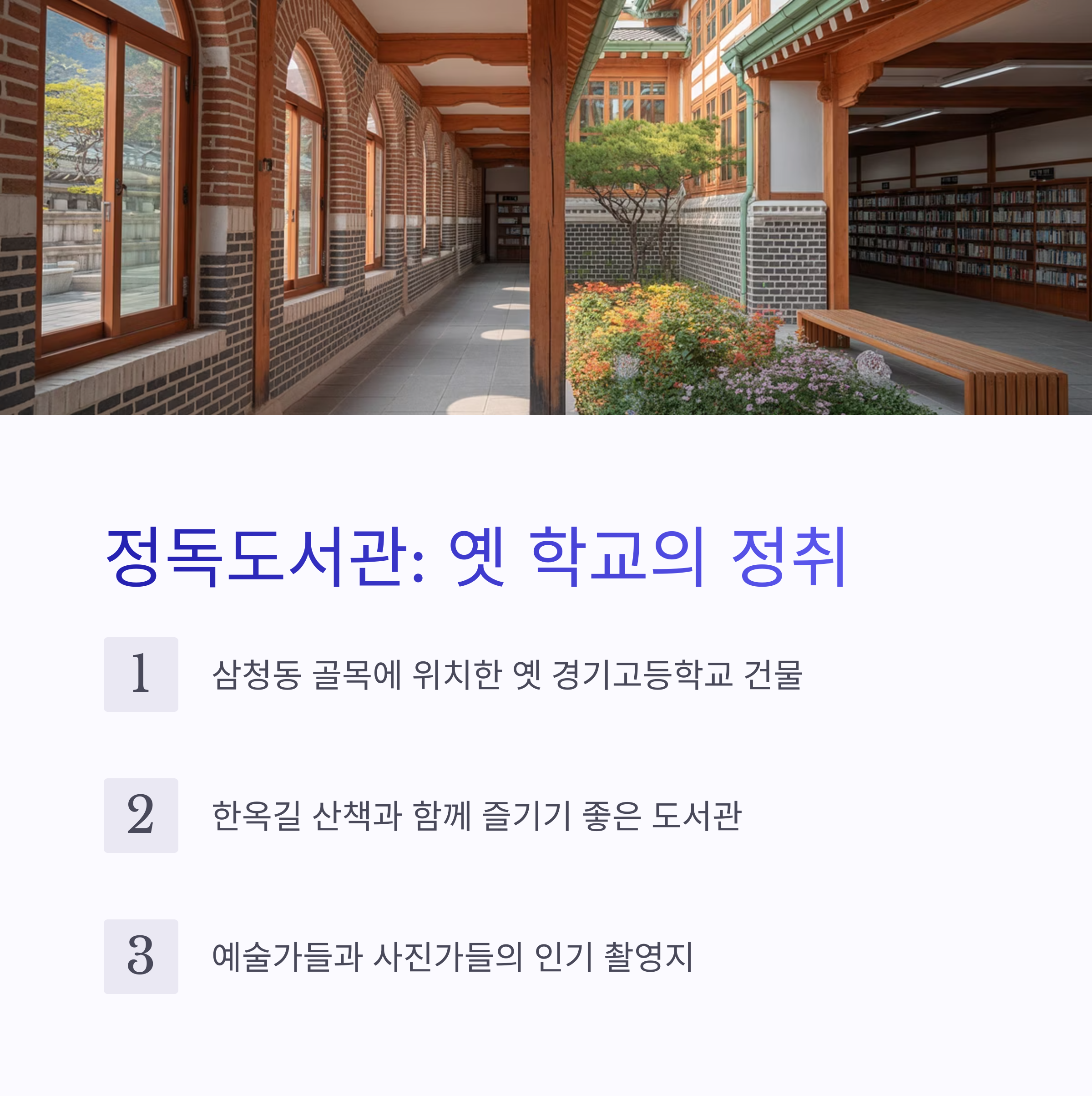 삼청동 골목에 위치한 정독도서관은 조용한 한옥길 산책과 함께