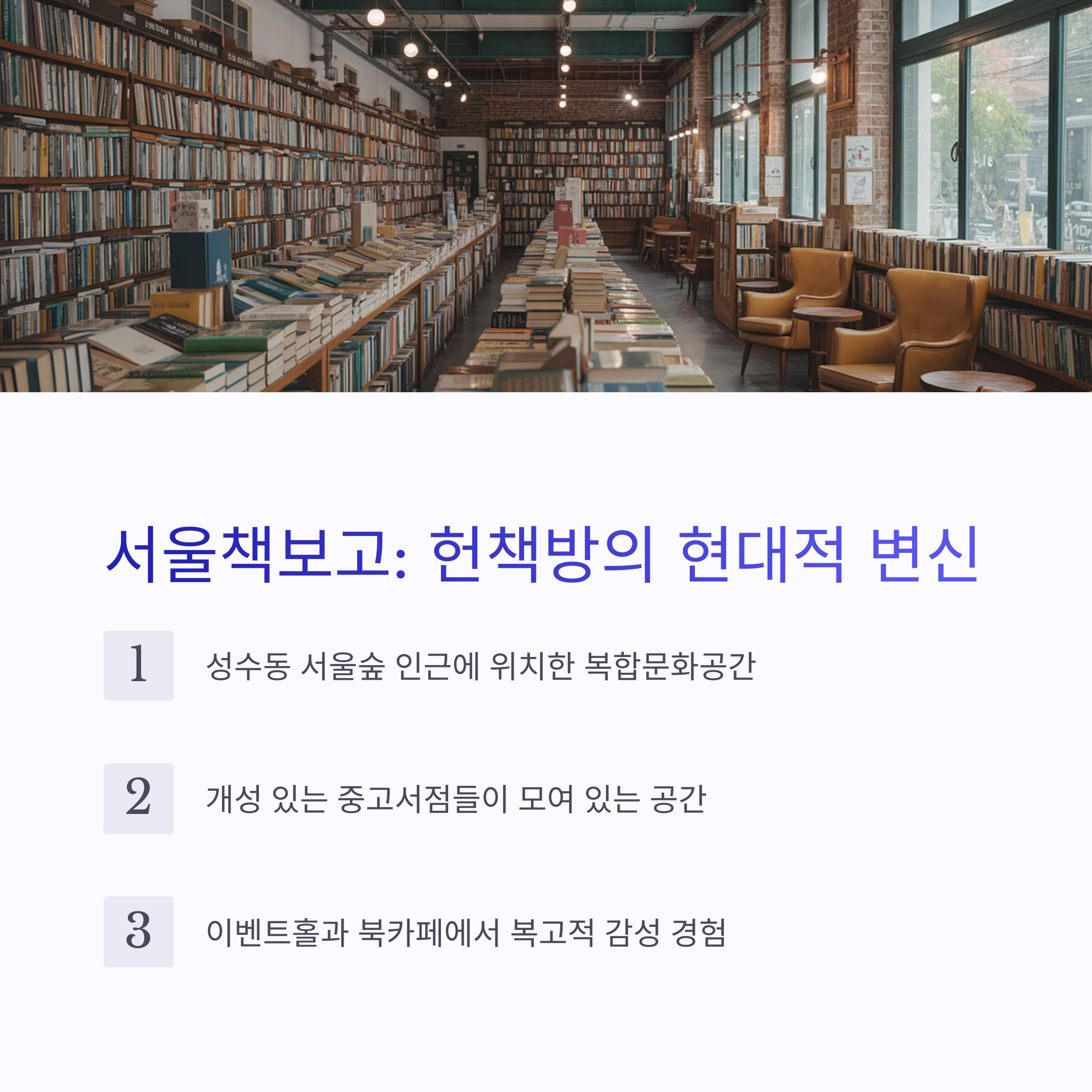 성수동 서울숲 인근에 위치한 서울책보고는 과거의 헌책방을 현대적으로