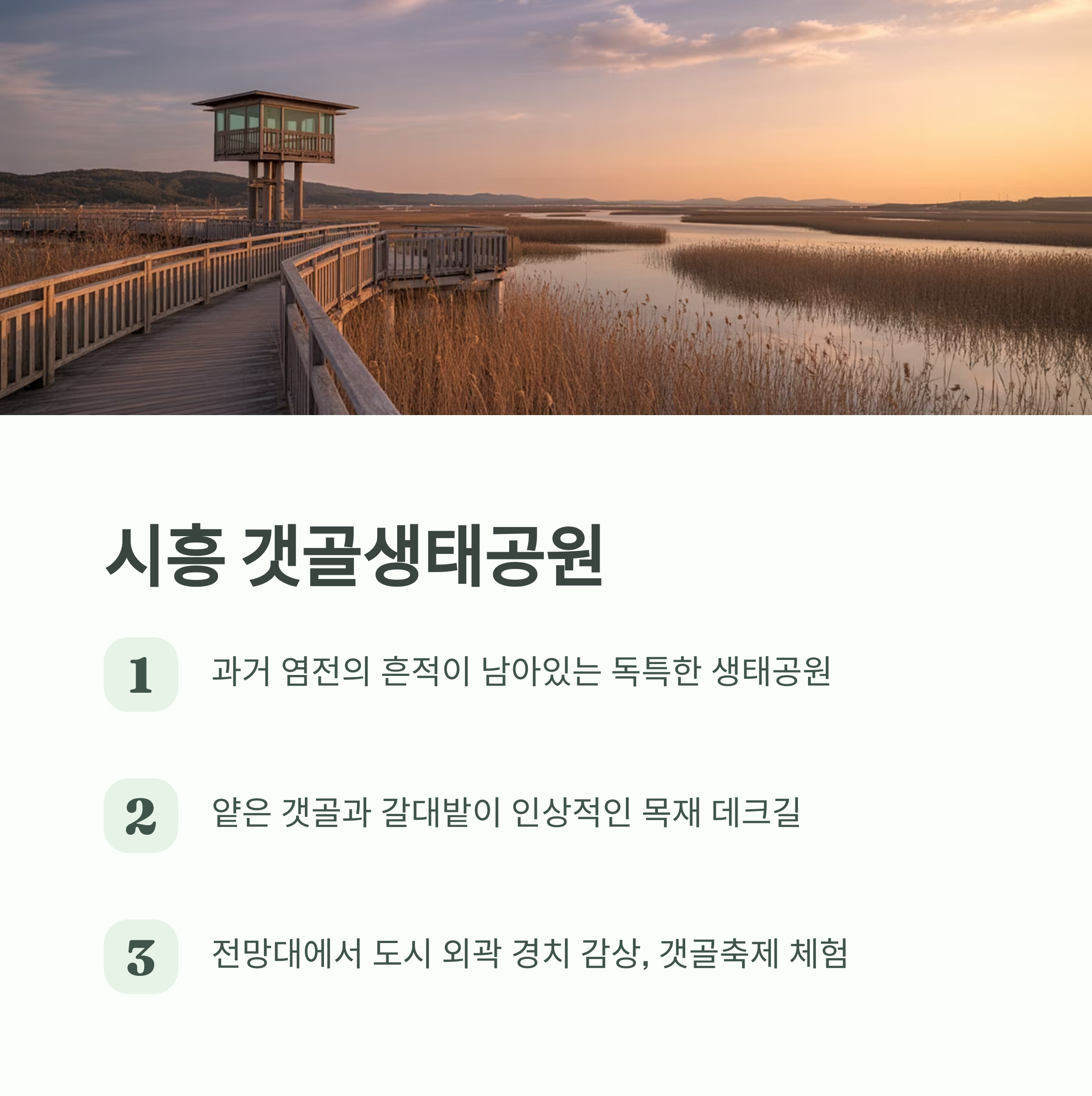 | 시흥 갯골공원 | 독특한 염전 생태와 갈대길 산책 경험 가능 |