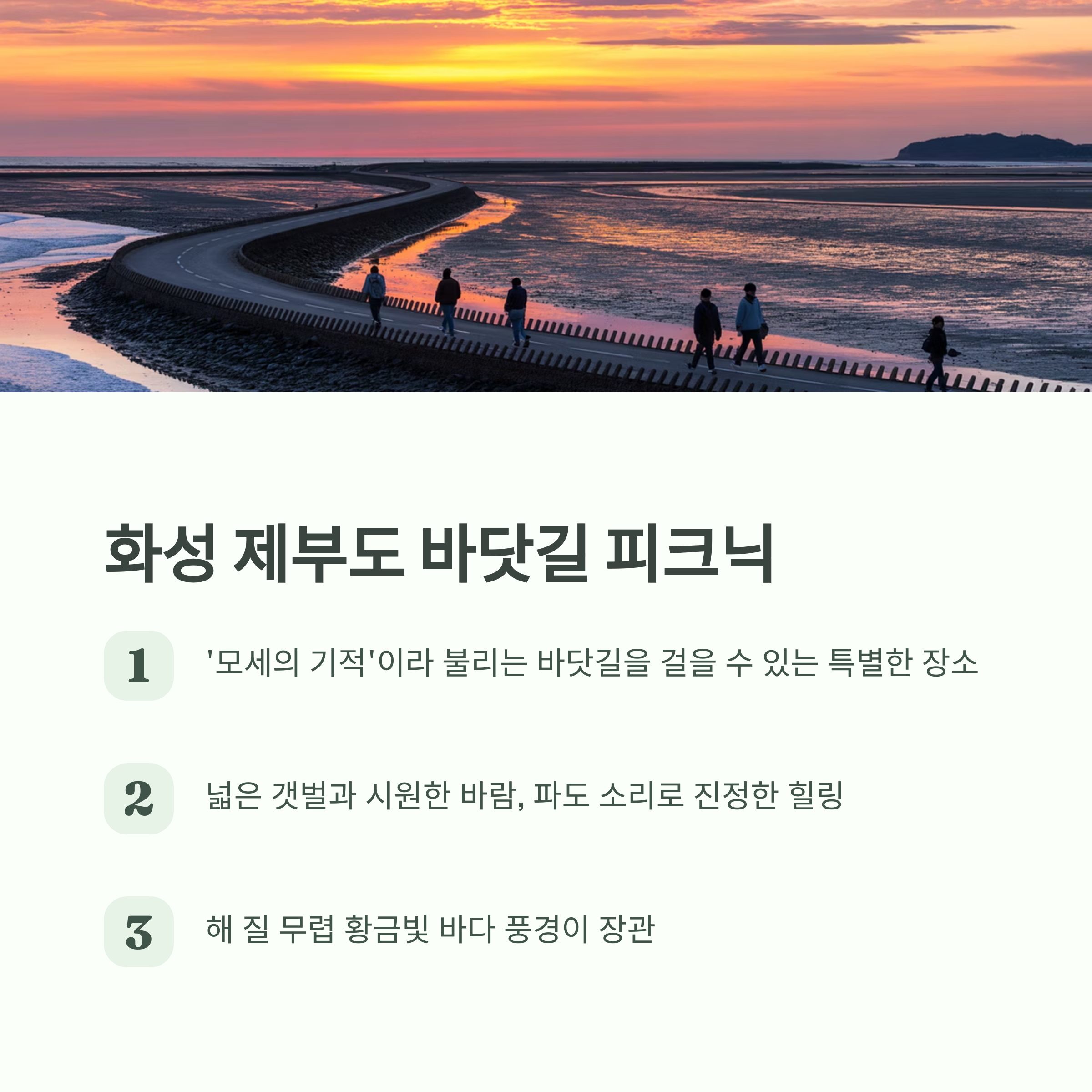 | 화성 제부도 | 바닷길 체험과 해변 피크닉 가능 |