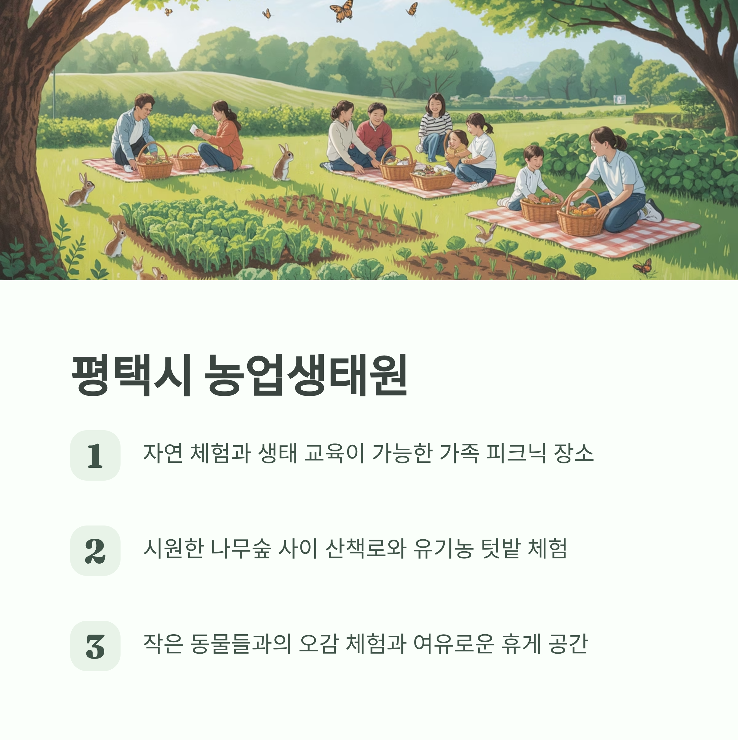 | 평택 농업생태원 | 자연 교육과 피크닉을 동시에 즐길 수 있음 |