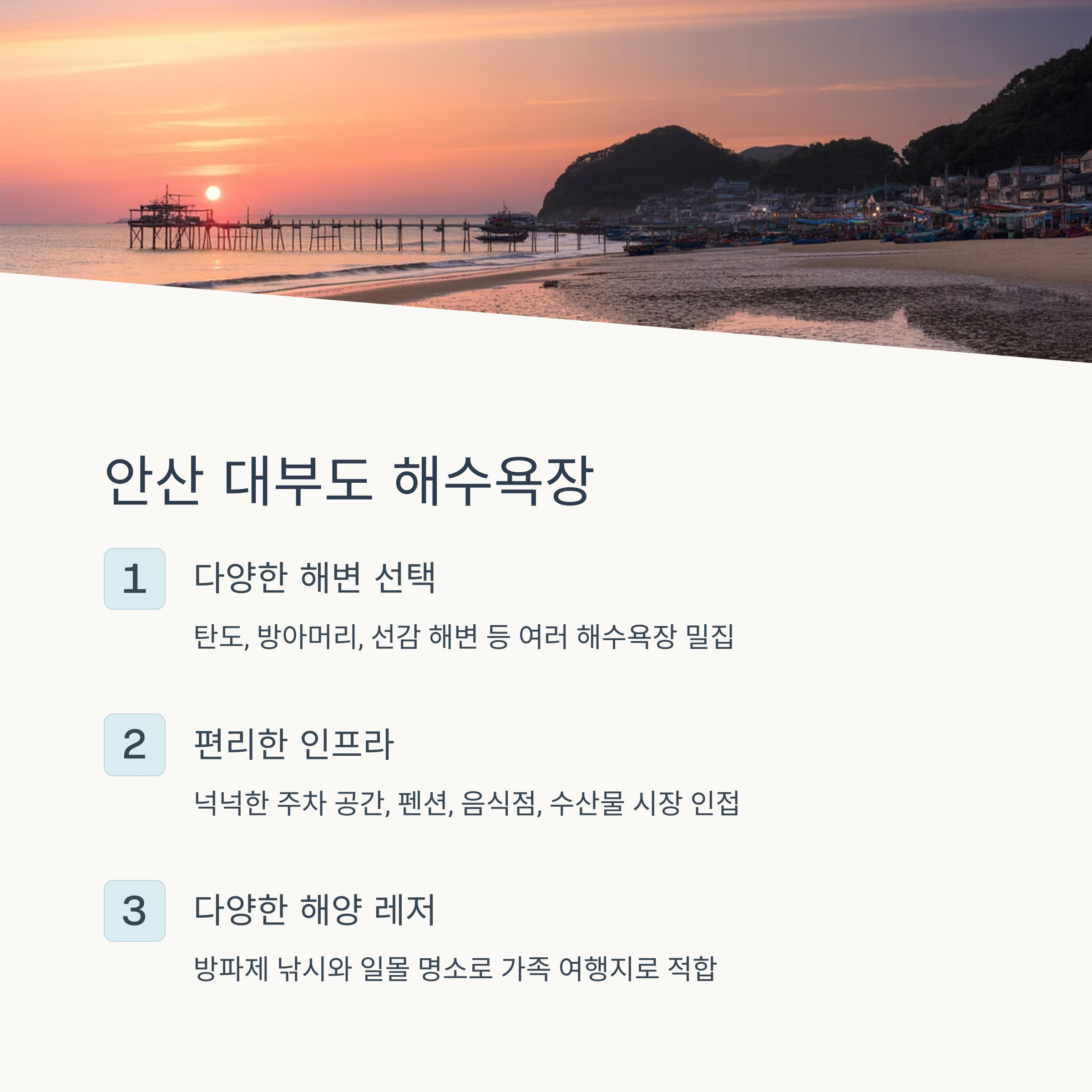 | 대부도 | 다양한 해수욕장 밀집, 숙소와 맛집 인프라 풍부 |