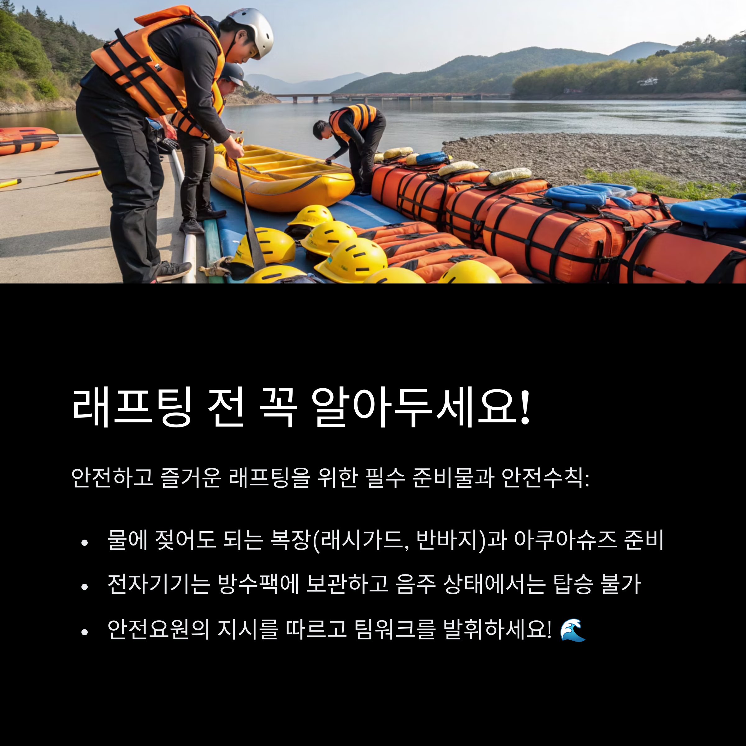- 기본 장비(구명조끼, 헬멧, 패들)는 현장에서 제공됩니다.