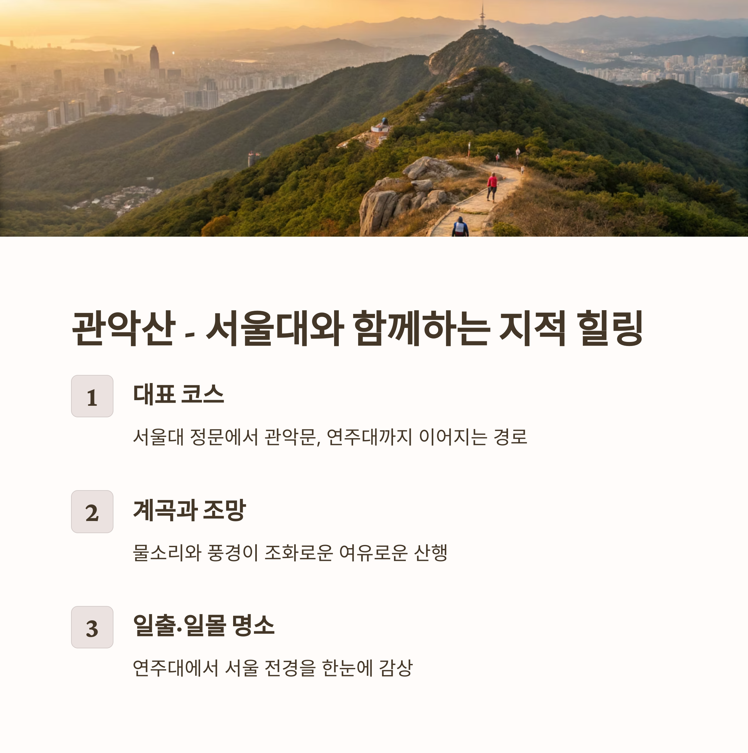 | 관악산 | 서울대입구역 | 봄, 가을 | 지적 산행, 조망 우수 |