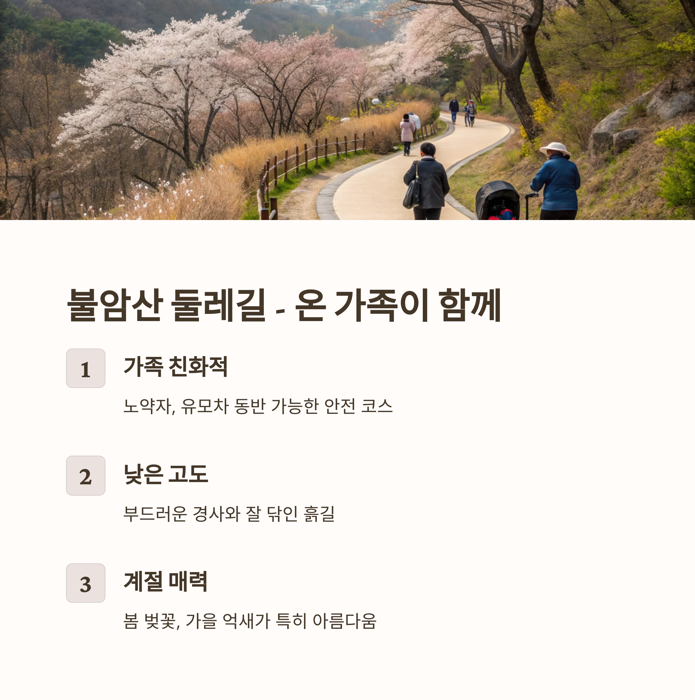 | 불암산 | 상계역, 중계역 | 봄, 가을 | 가족 산책코스, 안전 |