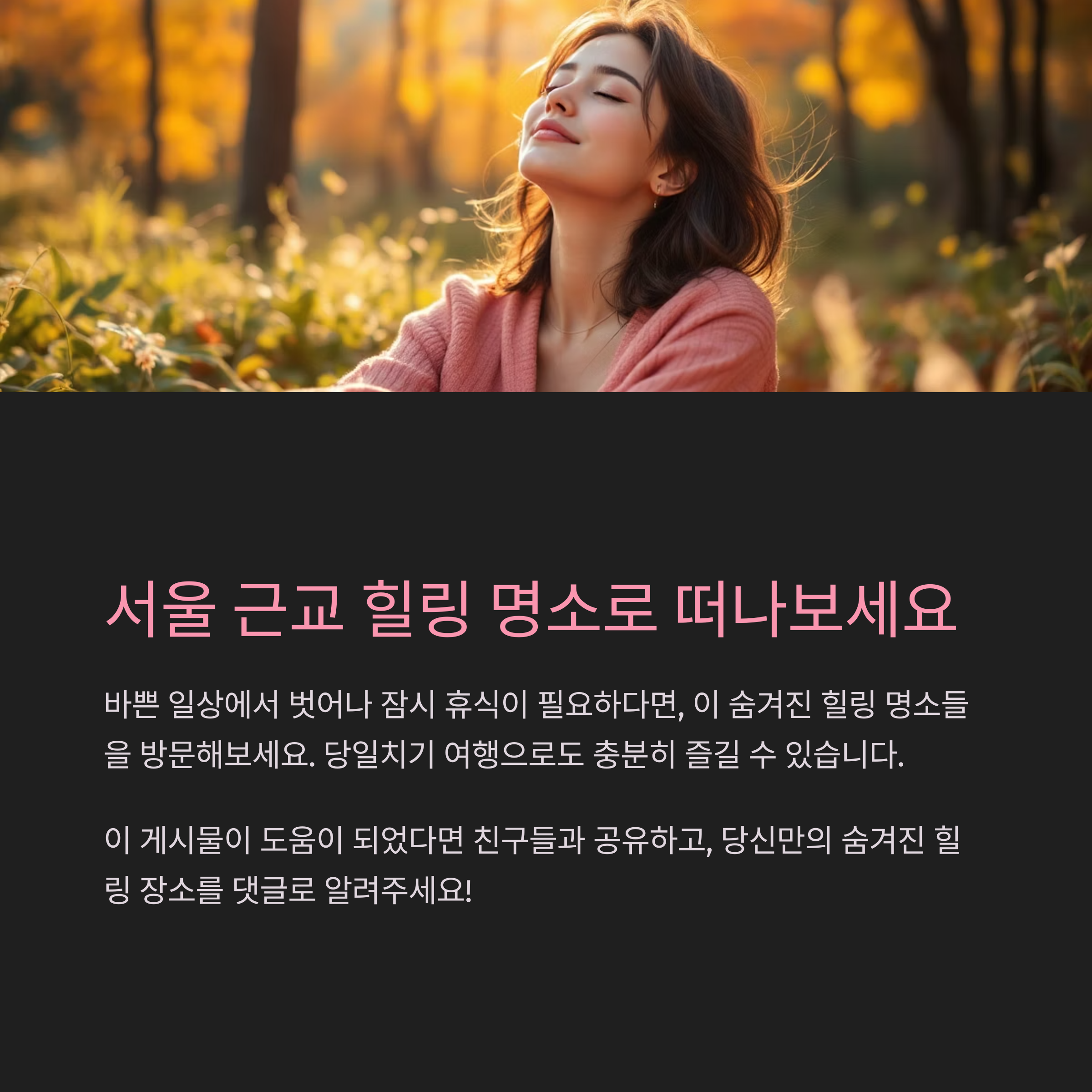 서울의 소음과 바쁜 일상에서 벗어나고 싶을 때, 멀리 가지 않아도 쉴 수 있는 힐링 명소들이 도심 주변에 가득합니다. 여전히 조용하고 여유로운 분위기를 간직한 잘 알려지지 않은 장소들을 모았습니다. 당일치기 여행, 짧은 드라이브, 혹은 조용한 산책을 원하신다면 꼭 들러보세요.