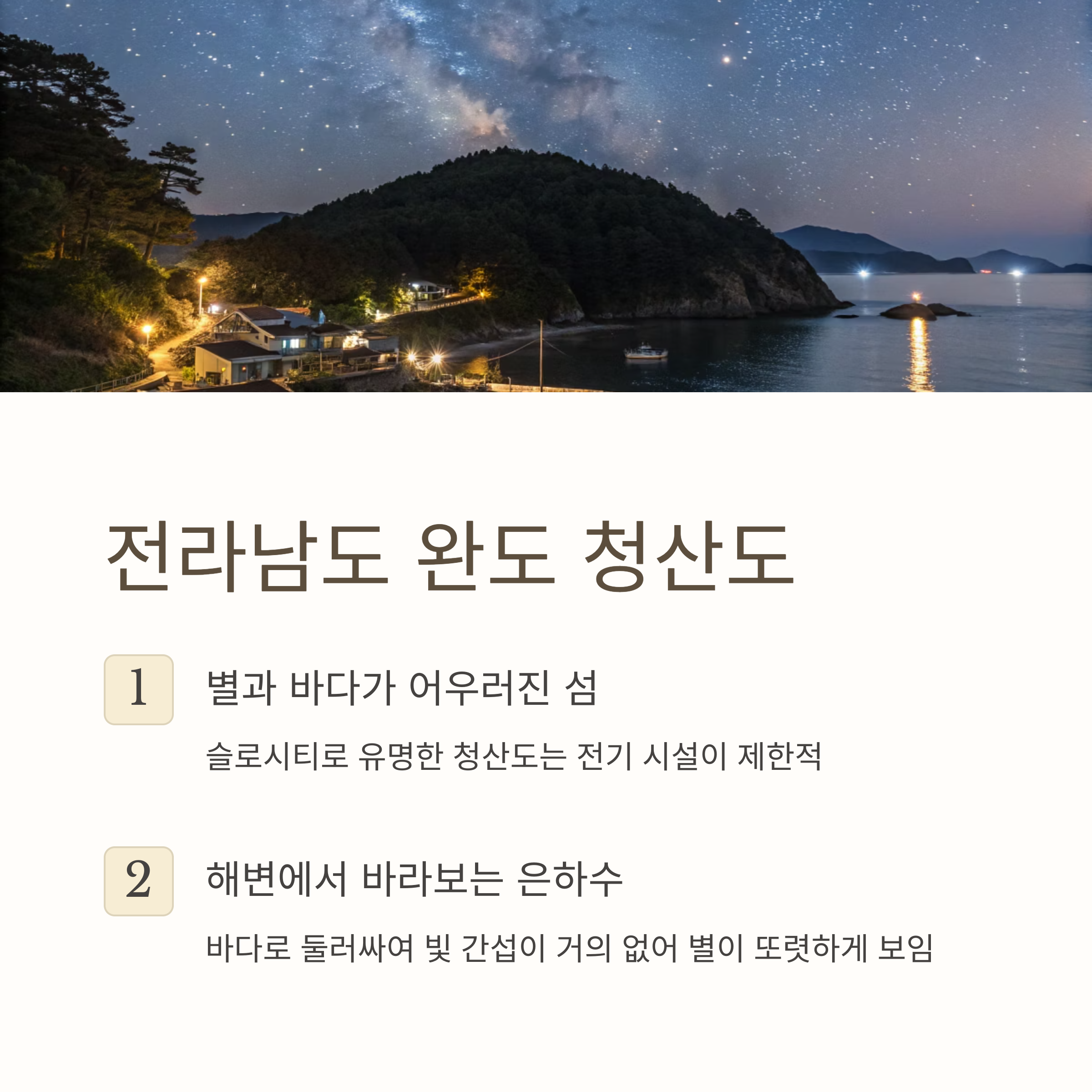 청산도는 '슬로시티'로 유명할 뿐 아니라 밤에는 별빛 명소로도 사랑받습니다.