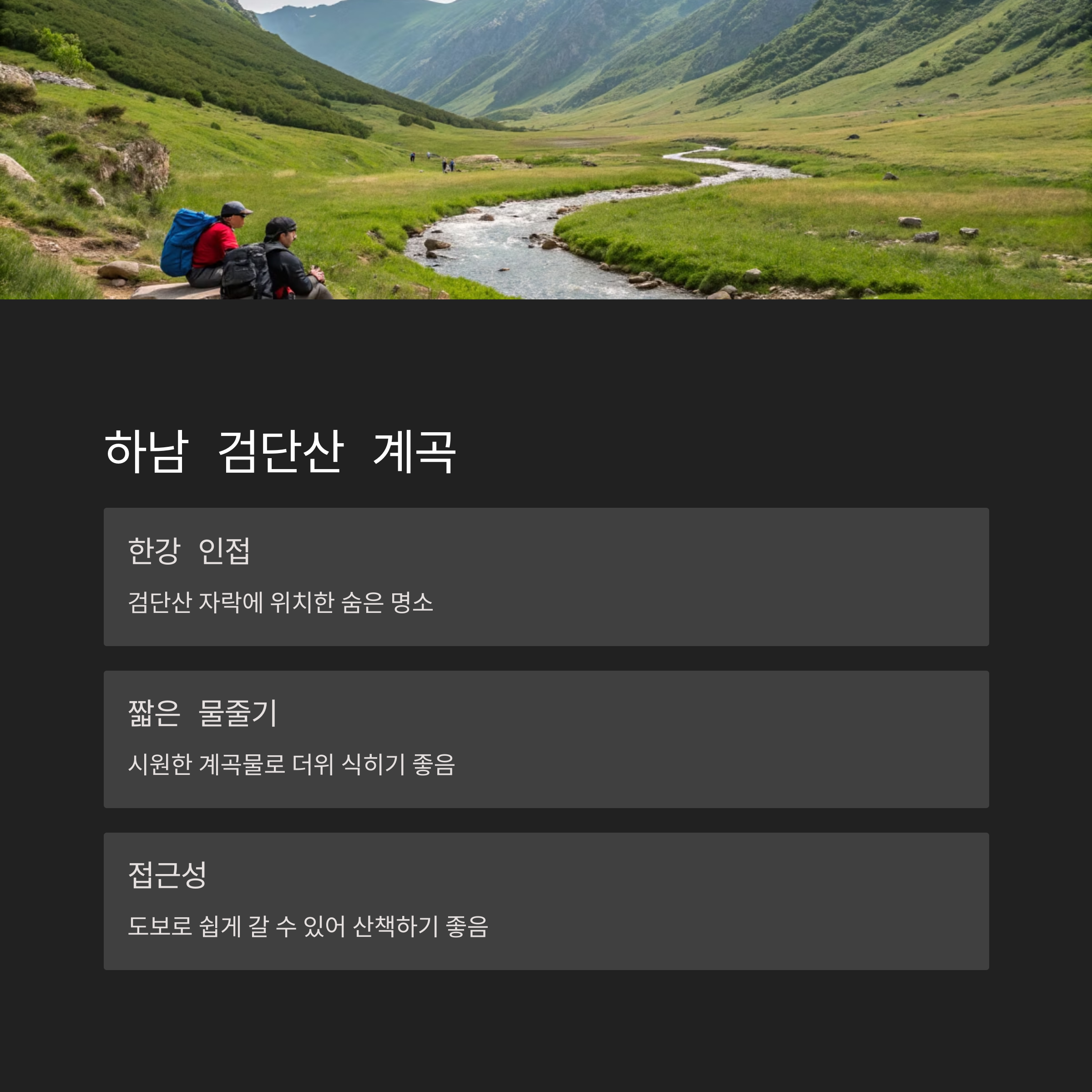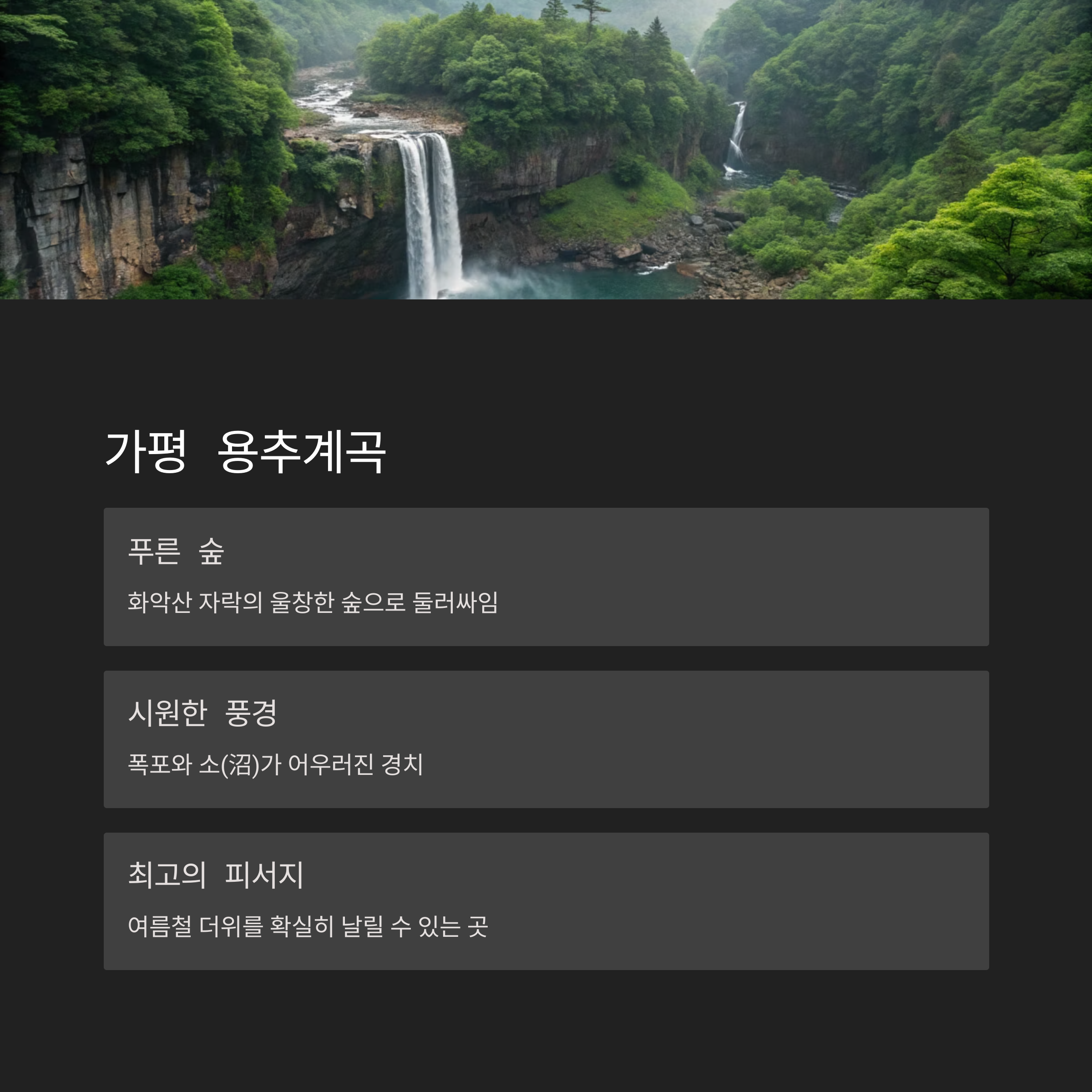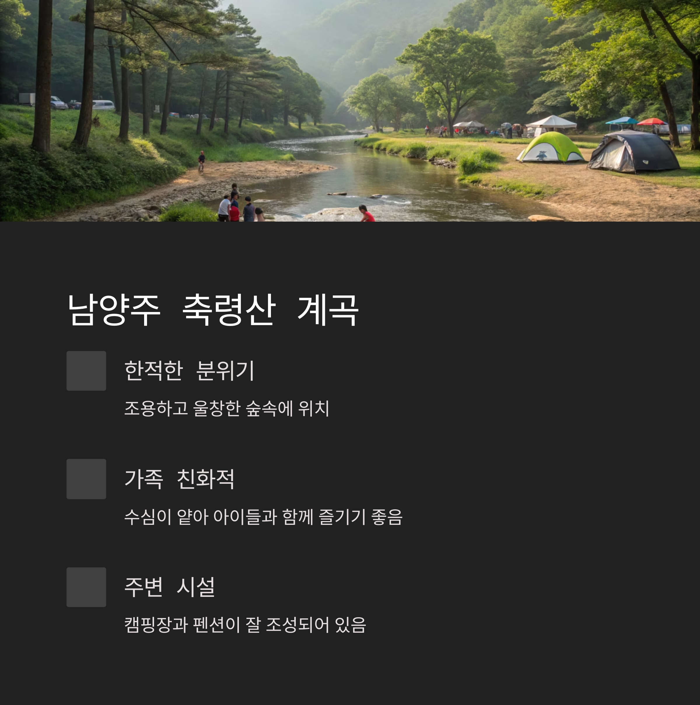| 축령산 계곡 | 남양주 | 조용하고 숲이 울창함 |