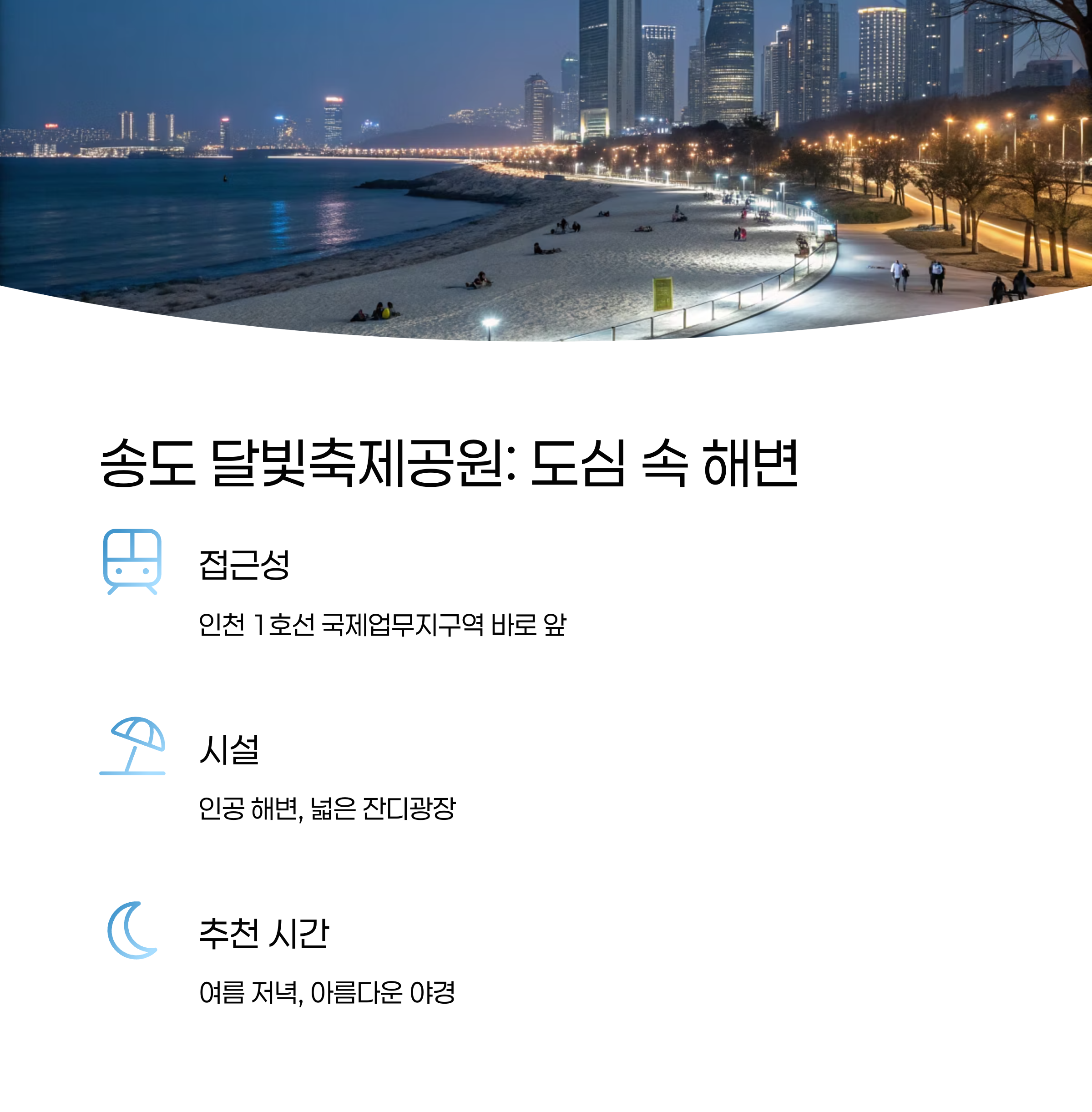 | 송도 | 국제업무지구역 | 야경, 인공 해변, 도심 속 힐링 공간 |