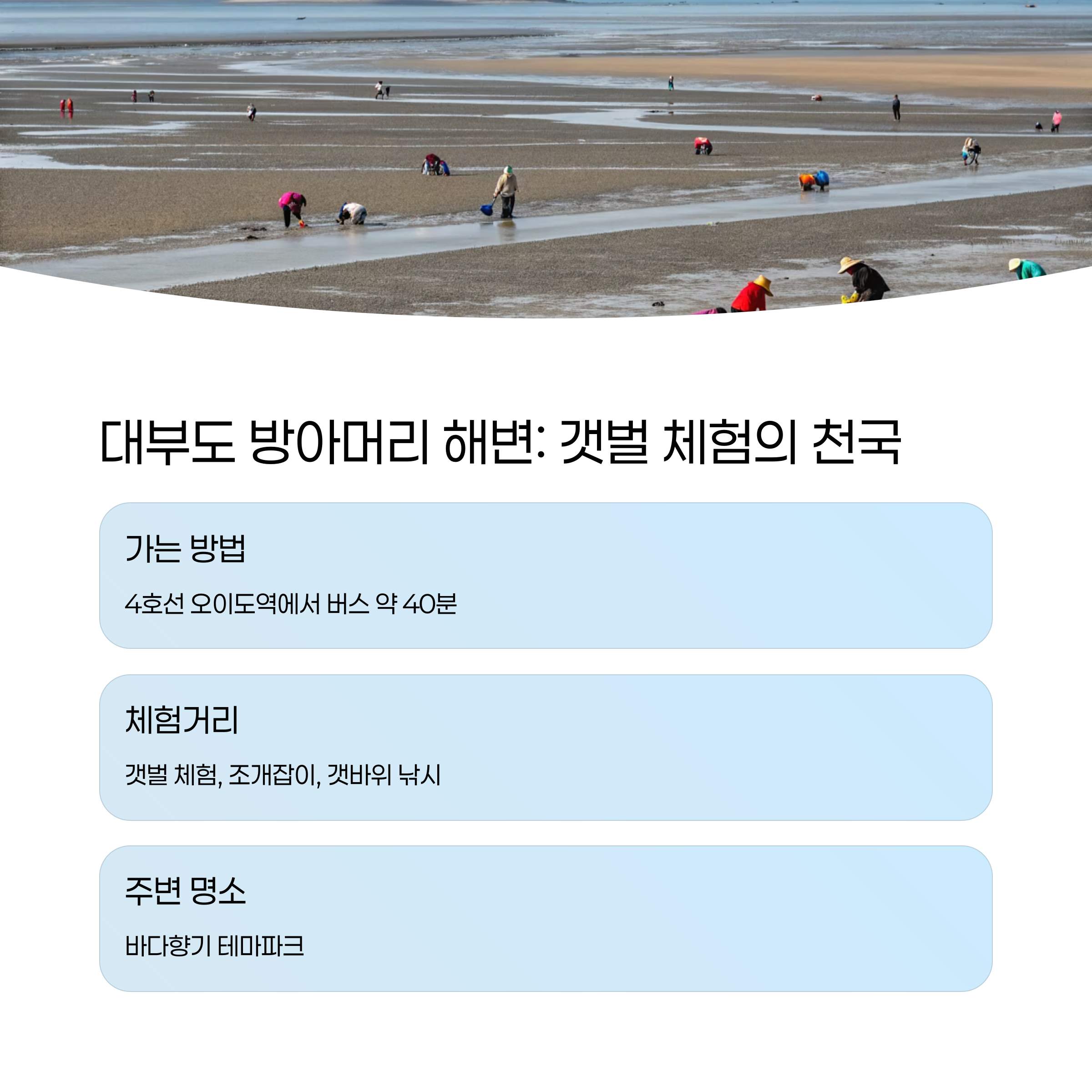4호선 오이도역에서 버스를 타고 약 40분 정도 이동하면 대부도 방아머리 해변에 도착할 수 있습니다. 서해 특유의 갯벌 체험이나 갯바위 낚시를 즐길 수 있어 가족 단위 나들이 장소로 제격입니다.