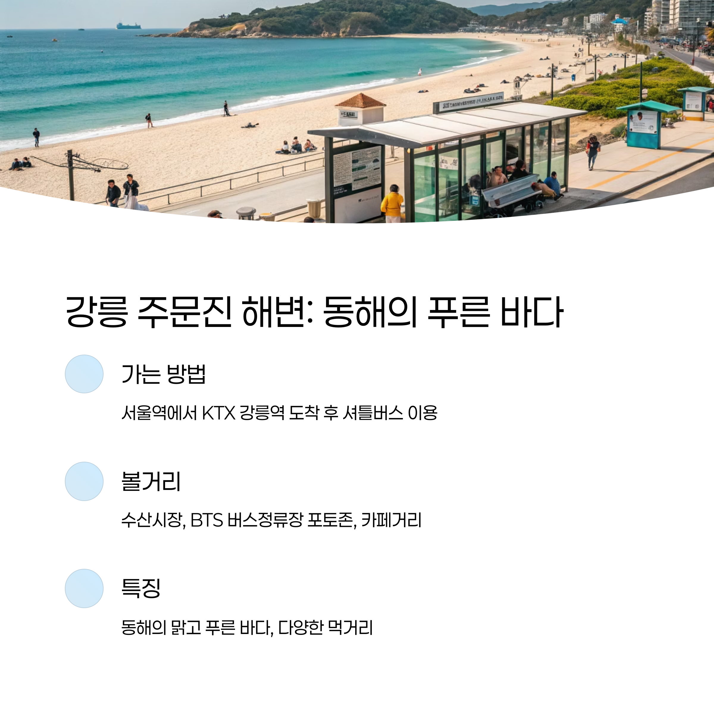 서울역에서 KTX를 타고 강릉역에 도착한 뒤, 강릉 시내에서 지하철처럼 운영되는 셔틀버스를 이용하면 주문진 해변까지 쉽게 갈 수 있습니다. 완전한 지하철 노선은 아니지만, KTX와 시내버스 환승만으로도 동해를 만날 수 있는 현실적인 대중교통 코스입니다.