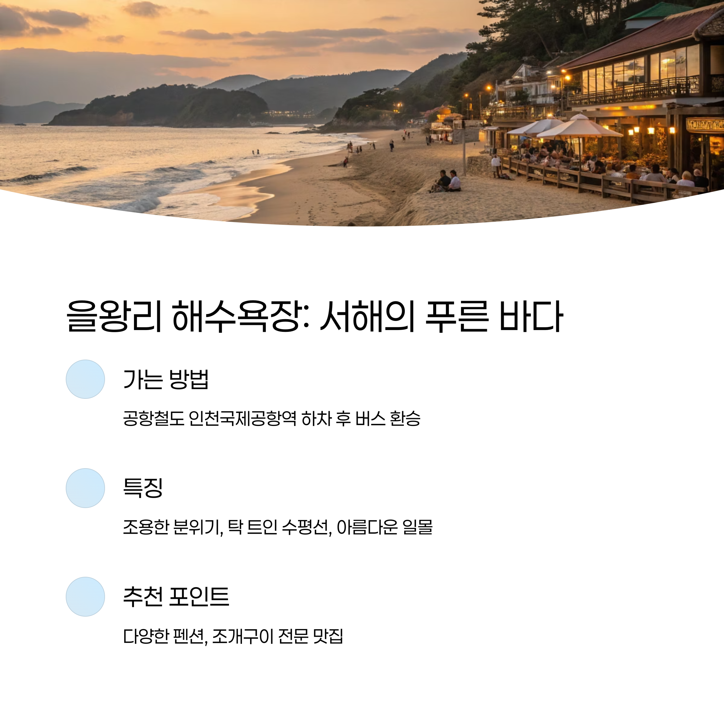공항철도를 타고 인천국제공항역에서 하차한 뒤 버스를 갈아타면 을왕리 해수욕장에 도착할 수 있습니다. 비교적 조용하면서도 탁 트인 수평선을 자랑하는 이 해변은 특히 아름다운 일몰로 유명합니다.